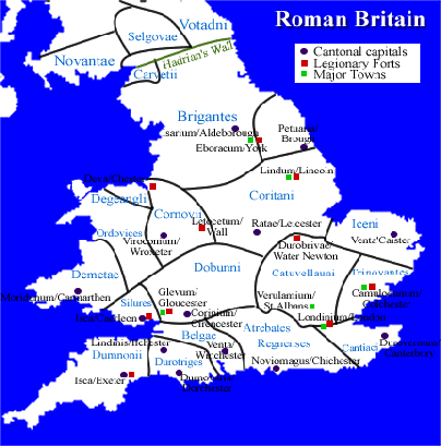The following map shows the locations of the principal civil and military features of Roman Britain.